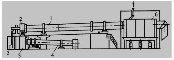 1—窑体;2—窑头小车;3—热烟室;4—冷却筒;5—窑头鼓风机;6—集尘室;7—烟囱
